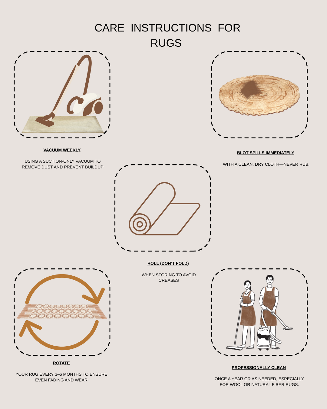 If spills occur, do not rub the stain instead blot immediately